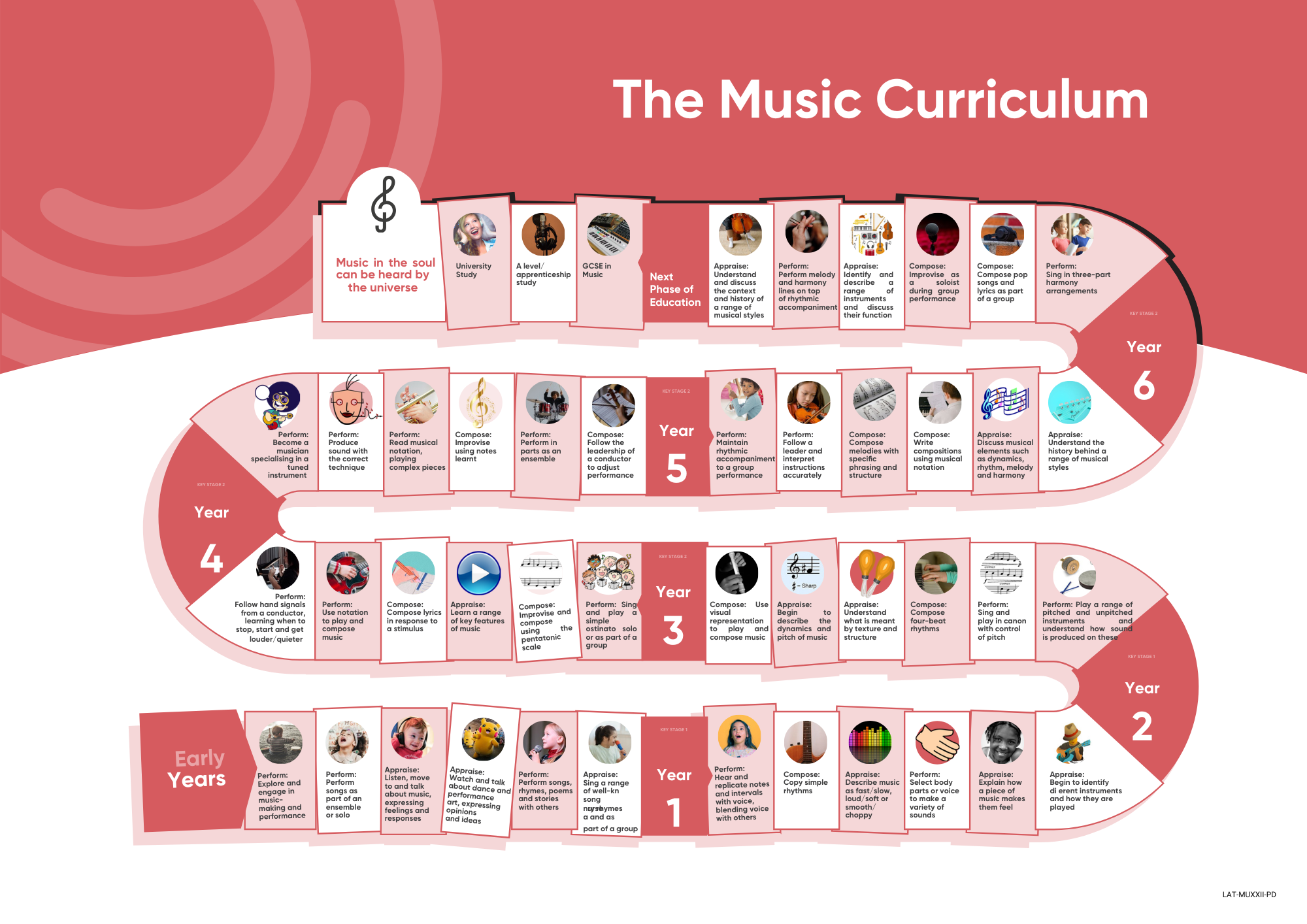 - Sequences learning to ensure progressive development of musical skills and understanding across key stages.